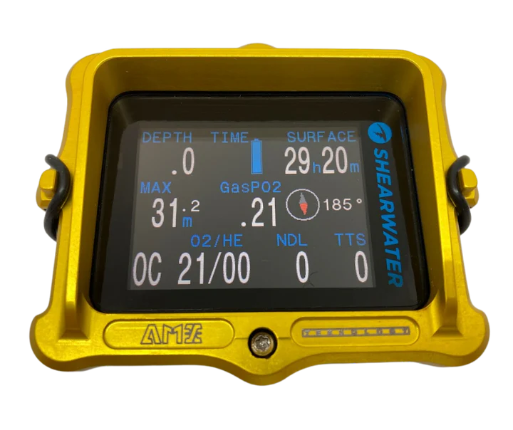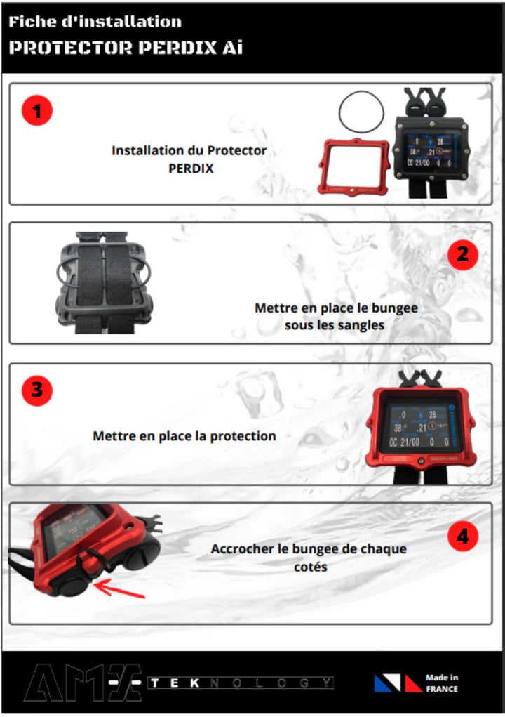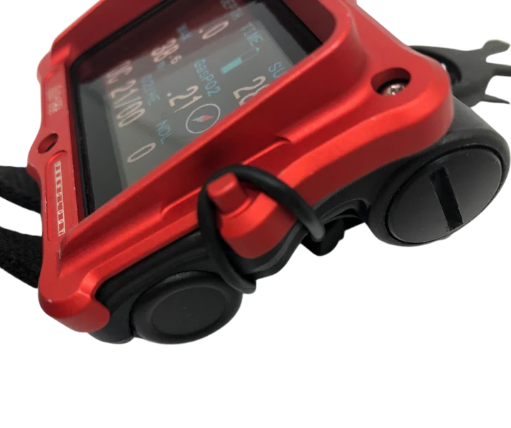 The Shearwater Perdix computer protection system is made of solid cut and anodized marine grade aluminum, it is designed to cover the original case by interlocking over the top but also the sides of the Perdix. The tight fit ensures good support, the protector is secured by 1 O-ring to avoid any loss.
