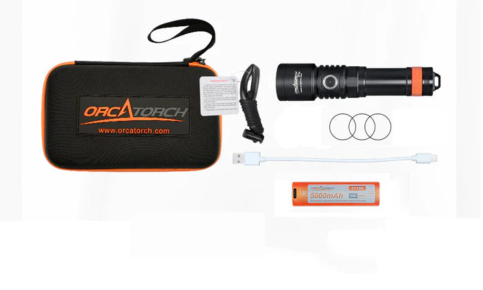 OrcaTorch D710 has been our best-selling dive light for many years now. Whether you're a recreational or a professional diver, you'll find the OrcaTorch D710 dive light useful in your underwater activities. With a max of 3,000 lumens, the D710 is one of the strongest torches in its class. But, you have plenty of brightness settings to choose from if you prefer less power. It runs on one OrcaTorch 21700 5000mAh rechargeable battery with USB-C charging port, easier for you to charge it anywhere.