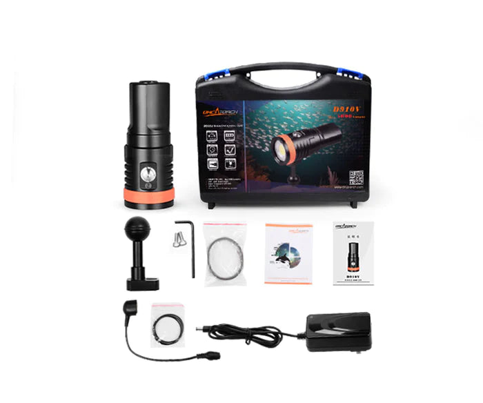 OrcaTorch D910V is a high CRI neutral white video light for underwater photography. It features a chip-on-board CREE LED array to create even illumination with a 5000 lumen output and 120 degree wide angle beam. With the industry’s first magnetic fast charging technology, the light can be charged without taking out the battery.